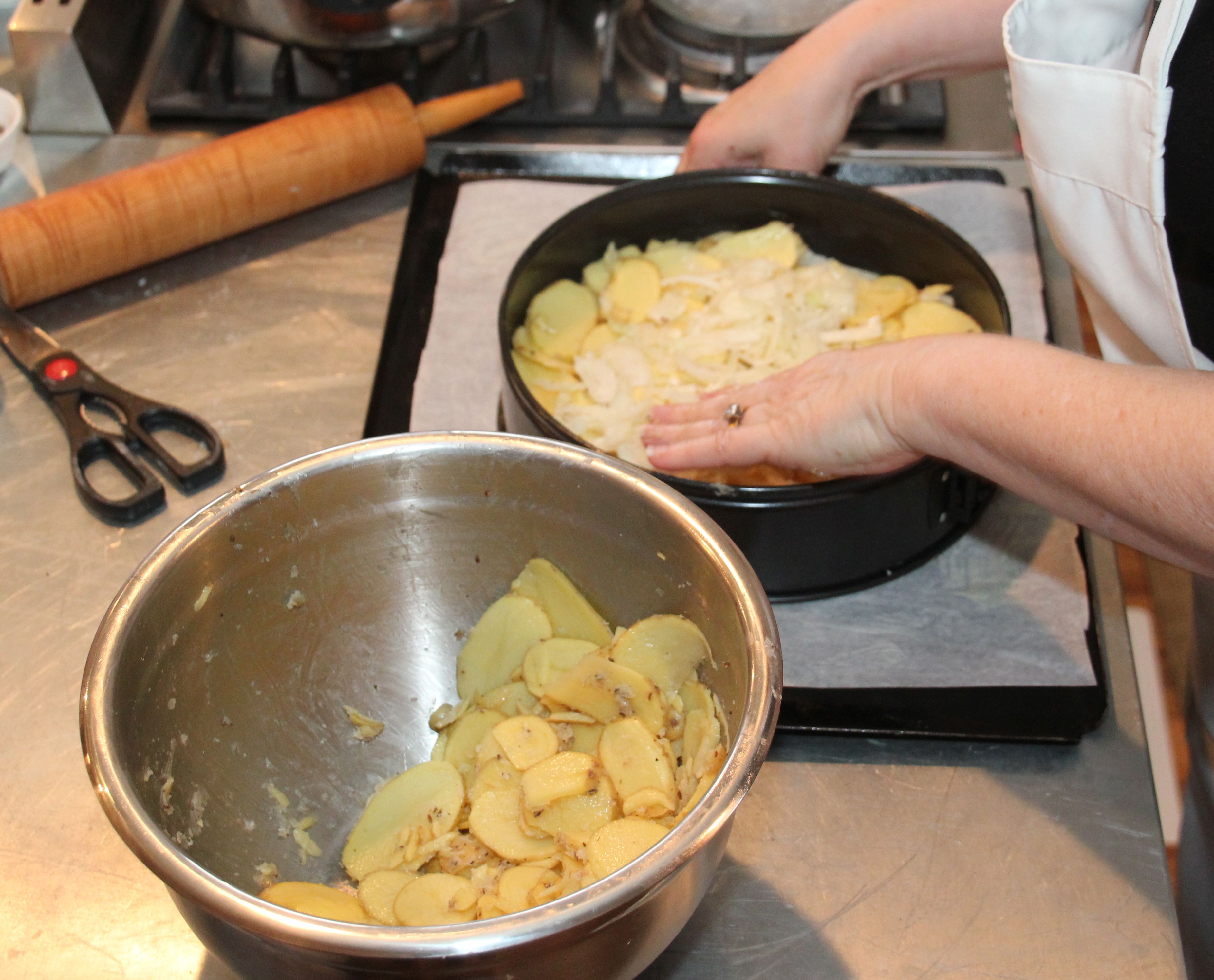 8.      Repeat layers twice more, finishing with layer of potatoes. Carefully remove the ring.