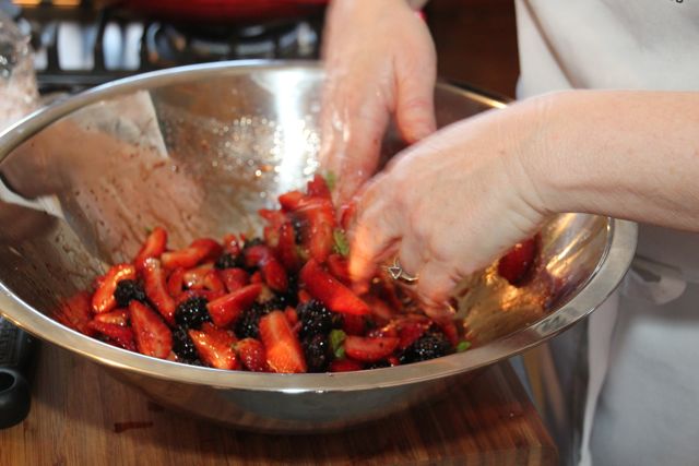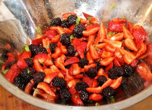 - 2. Tumble in the strawberries and blackberries, sprinkle the mint over them and gently toss, being careful not to bruise the berries. Taste and adjust the seasonings to your palate.