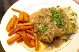 As I talked about yesterday, here is the missing recipe from our Knute Rockne dinner. These Sorghum-Glazed Baby Carrots are supper easy to make and they really help to round out our “vintage” dinner.
