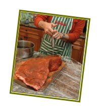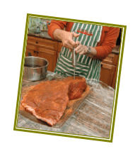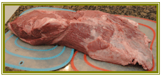 You can go one of two directions with the brisket; if you buy the brisket flats, you will have very little trimming to do. But, if you buy the full briskets, you will have some fat to be trimmed. If you are starting with a full brisket, start with it laying flat with the fat side up (isn’t that was some of us do when we lay flat on our backs?!?!) Press around on the fat and find the hard nuggets of fat. You will have to trim these off because they will not render down during the cooking process. Be sure to leave about ¼ inch of fat over the entire brisket. The fat is needed to help keep the brisket moist during cooking.