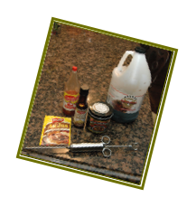 After the rub is applied, inject the warm marinade into the brisket with the fat side up. You will want to insert the needle as far into the meat as you can with out punching through the other side. Injections should be make about every 1 – 1-1/2 inches over the entire surface of the brisket.