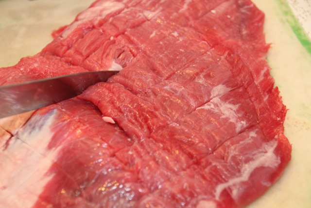 • Score steak on both sides in a crosshatch pattern, making shallow cuts on the diagonal no deeper than 1/8 inch and about ¼ inch apart.   This will keep the flank steak from curling as it cooks (you don’t have to score sirloin).