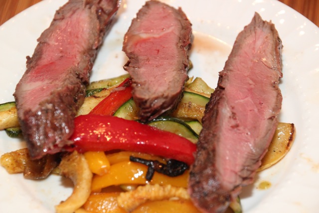 • Oil the grill. Place the flank steak on the grill and cook approximately 4-6 minutes per side for medium-rare.  If using sirloin steak, medium rare will take a bit longer, about 5-8 minutes.