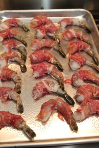 - Cut prosciutto length-wise for a total of 10 strips, then wrap each shrimp with the prosciutto strips.