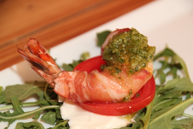 OK Picture this: you’re sitting at a quaint little sidewalk bistro in one of the quaint little coastal towns in Southern California. You sip on your class of wine as you watch the people parade up and down the street. The lighting just perfect with the sun filtering through the massive Ficus trees lining the street, warming the otherwise cool ocean breeze. Finally your order arrives . . . giant shrimp wrapped in prosciutto, sitting on Roma tomatoes and fresh mozzarella cheese, topped with creamy pesto sauce. Life just got a lot better!