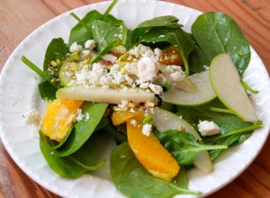 1. Divide spinach among four plates; top with pears, oranges, cheese & pistachios
